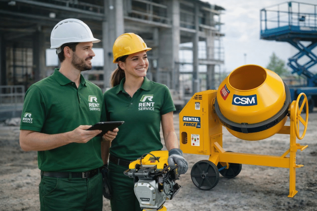 A RentService oferece locação de equipamentos para construção civil, atendendo profissionais da obra, empreiteiros e construtoras com máquinas revisadas e prontas para uso.